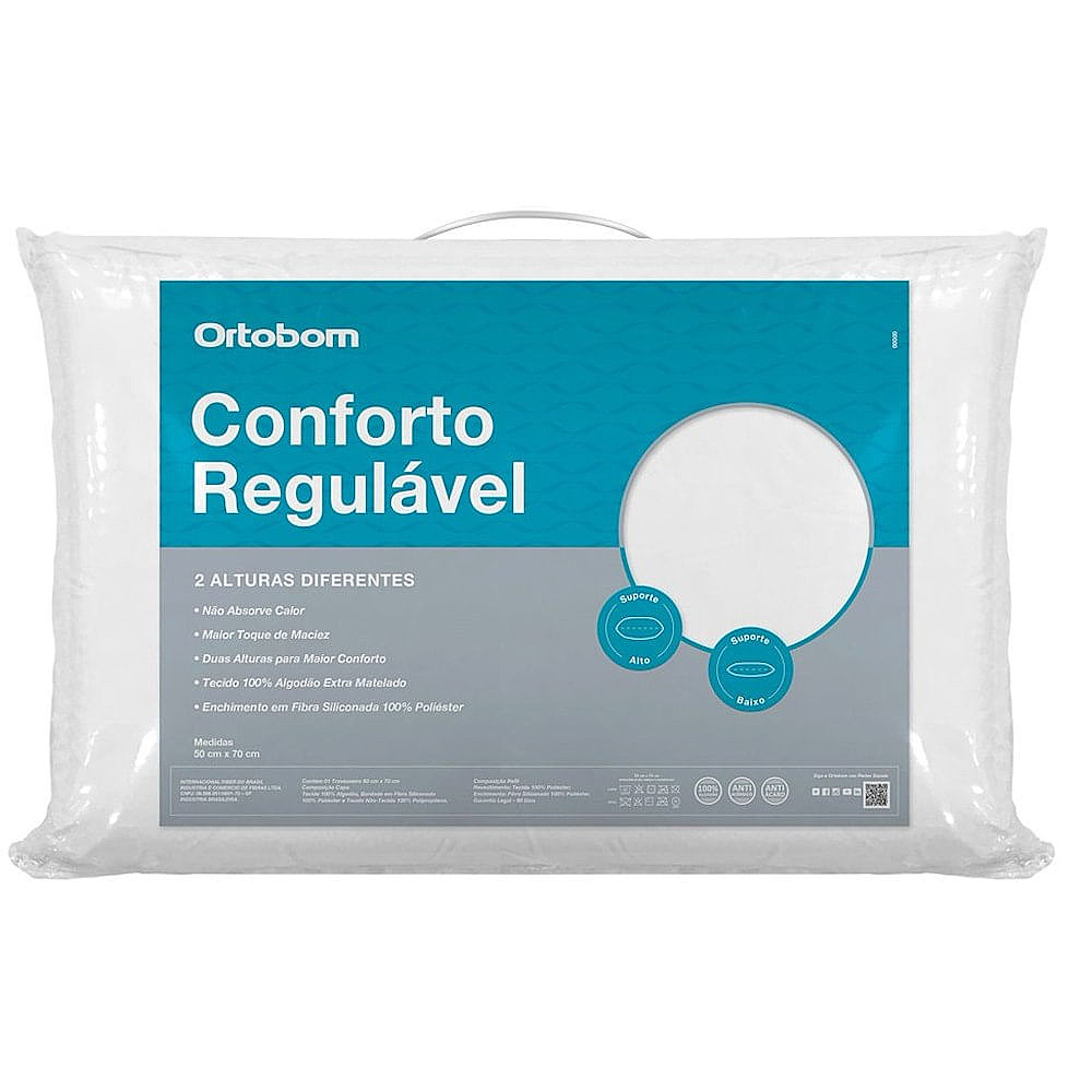 O Travesseiro Conforto Regulável Ortobom é a escolha perfeita para quem busca personalização e conforto. Com a capacidade de ser ajustado em duas alturas diferentes, ele se adapta às suas necessidades para garantir uma noite de sono perfeita. Sua capa de tecido 100% algodão e o enchimento com fibra siliconada 100% poliéster proporcionam suavidade e suporte, transformando seu descanso em uma experiência de bem-estar única.Toque Suave e Confortável Sinta a suavidade do Travesseiro Conforto Regulável Ortobom ao toque. A capa de algodão puro é macia e respirável, mantendo a sensação de frescor durante toda a noite. O enchimento de fibra siliconada garante um toque delicado e confortável, sem perder a firmeza necessária para um suporte ideal. Além disso, o tratamento antiácaro e antialérgico oferece proteção extra para noites tranquilas e saudáveis.